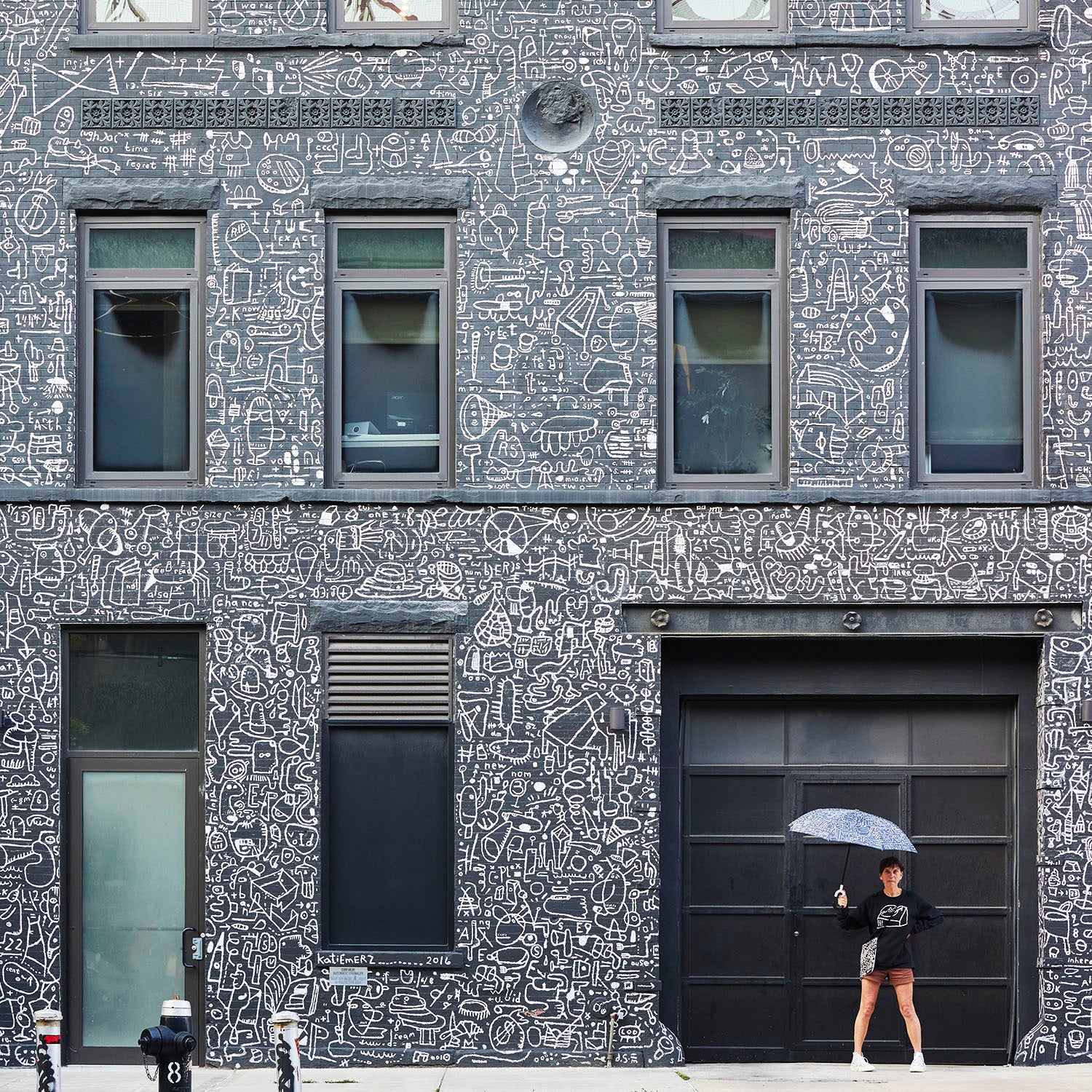 Katie is a Brooklyn-born muralist, inspired by the city itself, cartoons, and architecture. A nationally renowned artist, her recent public work creates a convergence between graffiti, coding, and the simple deduction of everyday language. These urban hieroglyphics illustrate a wildly animated library of dialogues, notes, words, architecture, math, and random visual connectors.