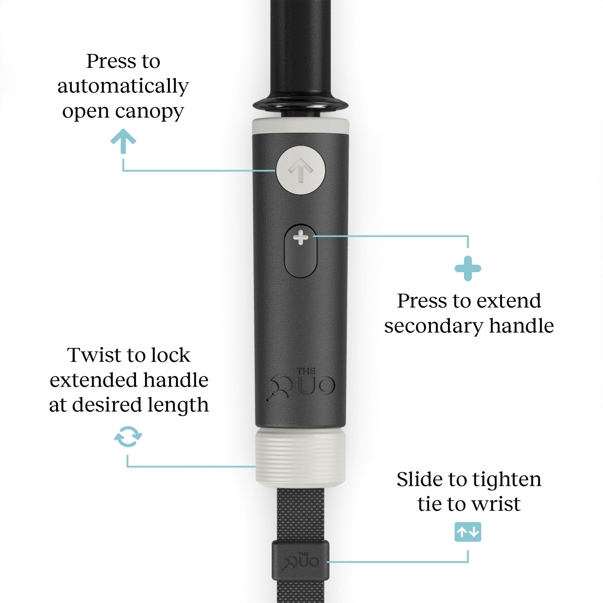 With patented dual-handle technology, The Duo easily adjusts to accommodate two hands, even at different heights, and the spacious 54-inch canopy is perfectly suited for you and a companion. With our auto-open function, it deploys with just the touch of a button. Then simply press another button to deploy the secondary handle, and twist to lock it into position at any length up to 12 inches. With a high-quality recycled polyester canopy featuring UPF 50+ UV protection, The Duo is a first-of-its-kind sun and rain umbrella specifically designed with two people in mind. Because two are better than one.