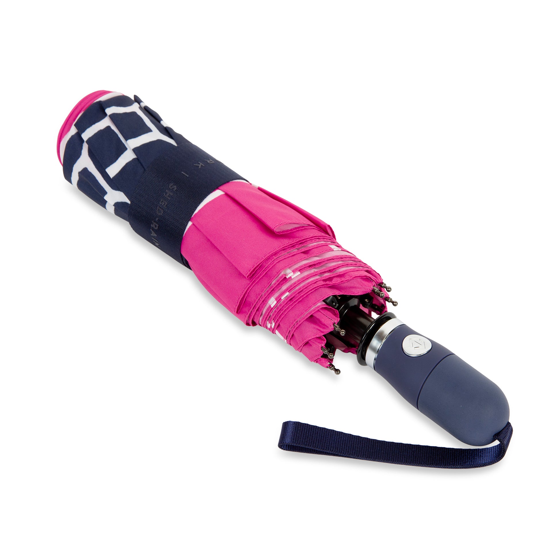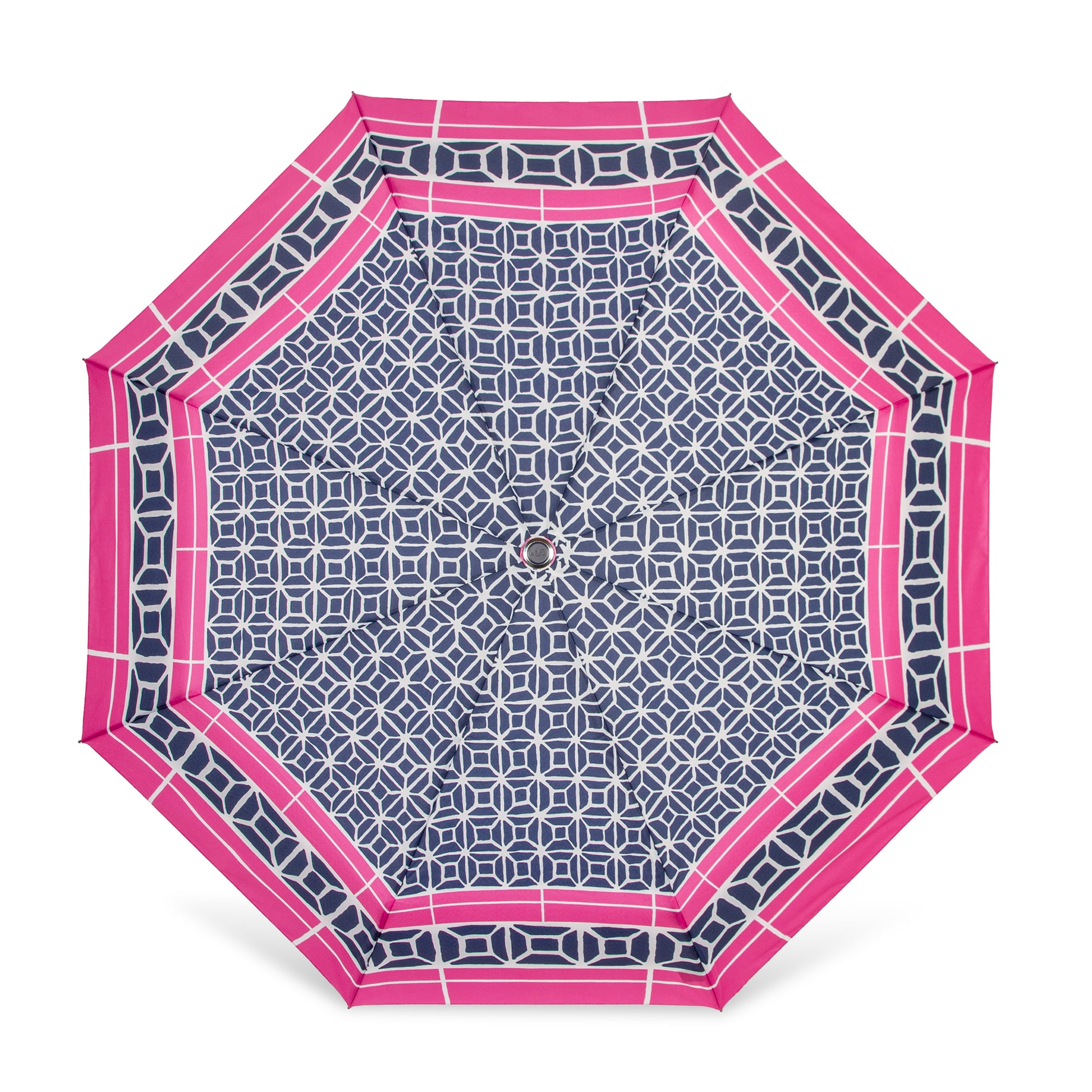 This chic, compact umbrella is the perfect blend of style and convenience. With an easy one-hand open design and wrist strap, this compact umbrella makes your travels a breeze. The geometric print and pop of pink will brighten up even the rainiest day.