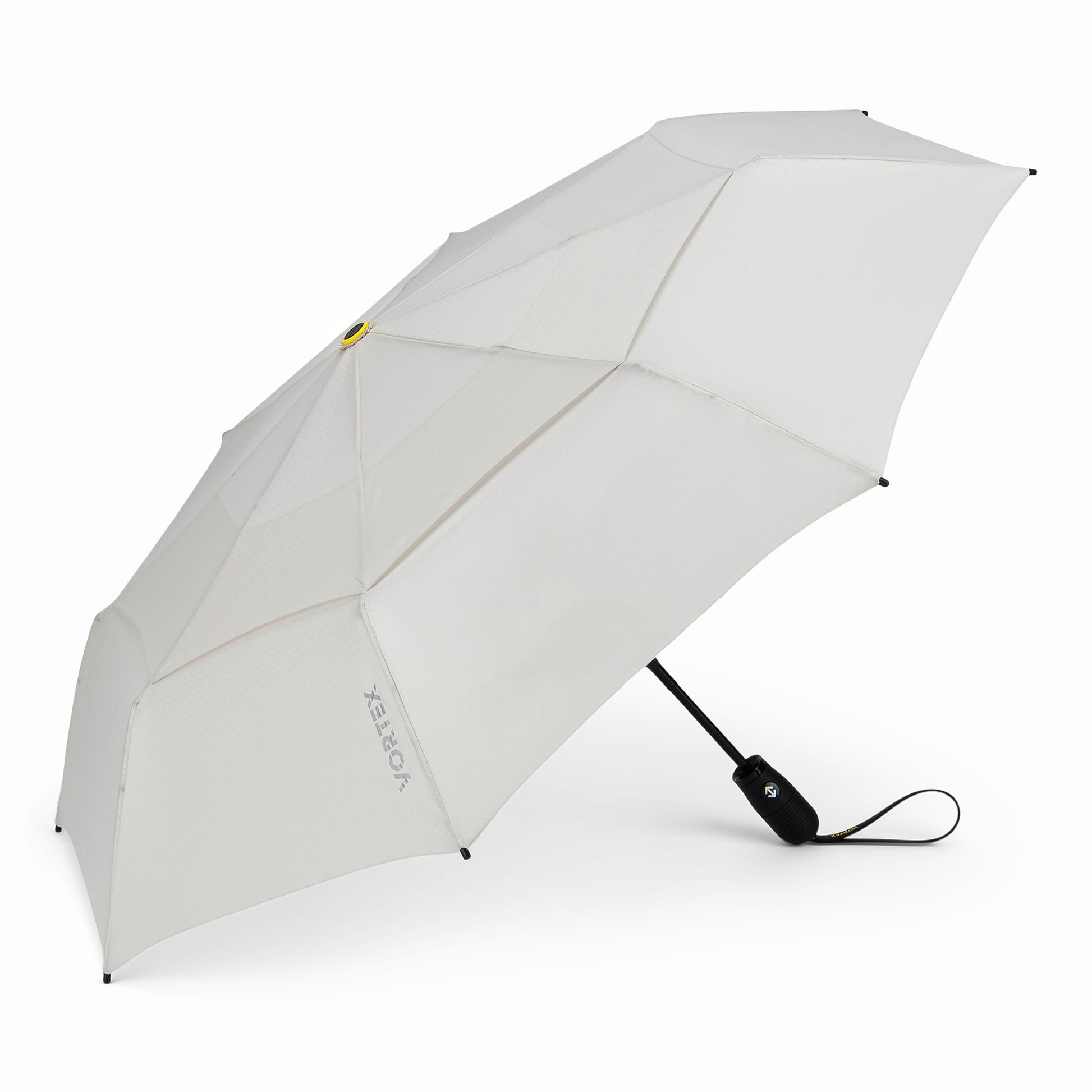 This compact windproof umbrella is small, yet impressively strong. Featuring steel ribs and shaft, an anti-inversion frame system, and strategically placed canopy vents to allow for airflow, it’s wind tunnel-tested and proven to resist winds up to 75 mph without flipping inside-out. The 43-inch canopy arc offers ample storm coverage with the press of our automatic open and close button. And it packs down to just 12 inches long, easily fitting in a handbag, backpack, or travel carry-on. It’s the perfect heavy-duty compact umbrella for world-travelers and work-commuters alike.